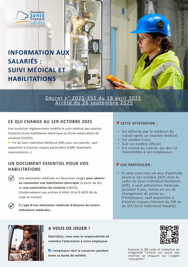 La réforme introduite par le décret du 18 avril 2025 simplifie les modalités de suivi médical pour les salariés concernés par les habilitations CACES et électriques, en remplaçant le suivi individuel renforcé par une attestation médicale valable cinq ans. Cette évolution réglementaire permet au PST Landes de recentrer ses ressources sur les risques les plus critiques et sur la prévention primaire.